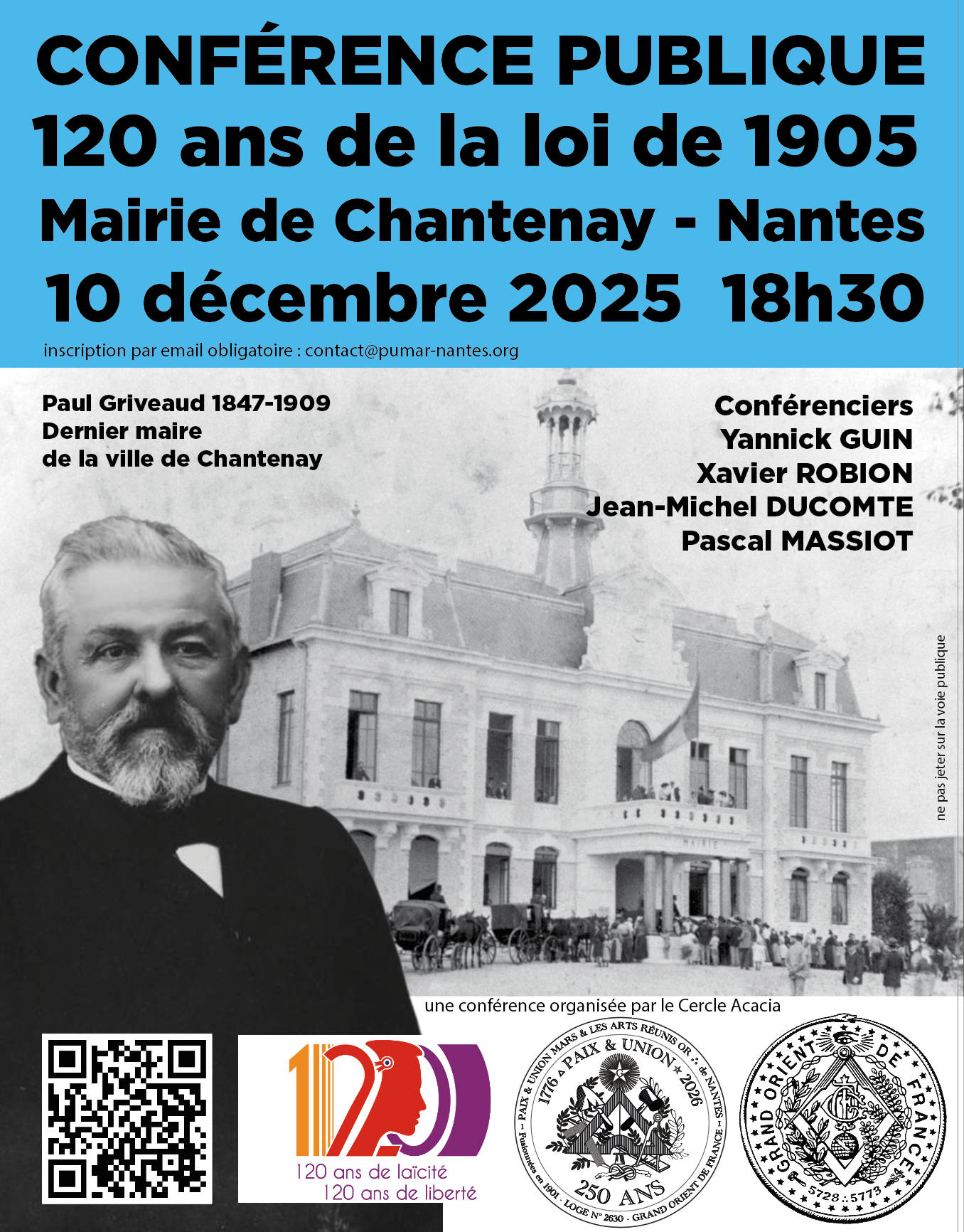 Yannick GUIN, professeur d’histoire contemporaine, précisera le contexte nantais des années 1890 -1910, et permettra de mieux comprendre les enjeux de cette époque et les décisions républicaines du dernier maire de la ville de Chantenay : Paul GRIVEAUD, militant socialiste et républicain, Vénérable Maître de la loge maçonnique nantaise du Grand Orient de France : « Paix et Union Mars et les Arts Réunis » de 1904 à 1906.